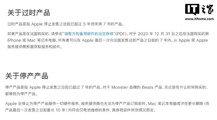 而对于停售已超过 7 年的产品,可能会被标记为“停产产品”(obsolete)。一旦被归为此类,苹果将正式终止其所有官方支持服务。