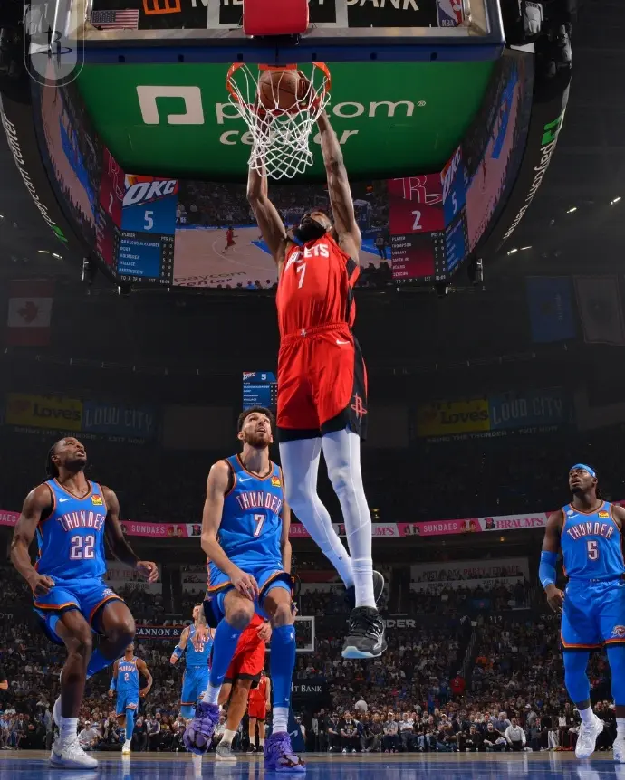 比赛一开场,火箭就亮出了杀招,死守四大阵容, 申京、史密斯、伊森、阿门·汤普森组成的锋线群,像一片移动森林,压得雷霆主场几乎窒息。这套“四塔”阵容让雷霆的防守顾此失彼,阿门汤普森趁机突击,半节狂砍10分,申京更是化身策应中枢,单节送出4次助攻。反观雷霆,亚历山大在重重包围下3投1中并出现3次失误,杜兰特手感也一般,火箭首节30-27领先雷霆。